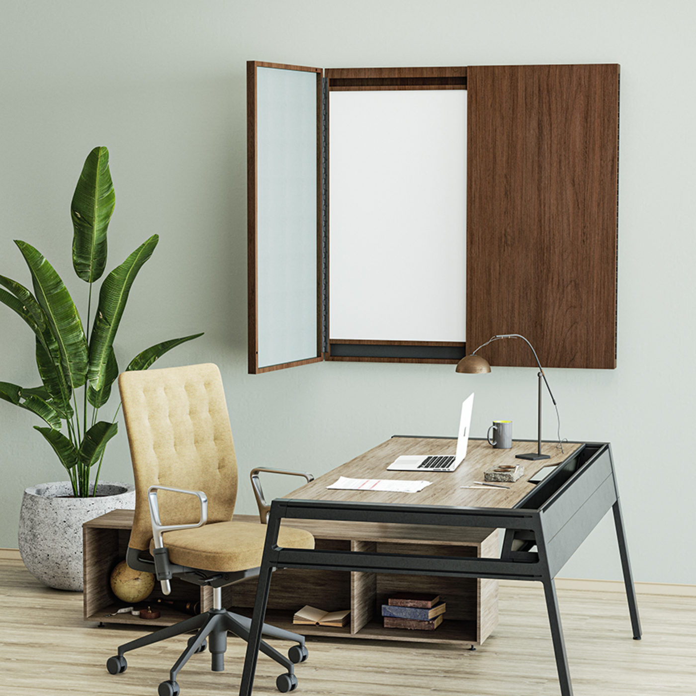 EVS™ en 77"l x 48"h (format 16:10) ou 60"l x 48"h et 48"l x 42"h pour les applications d'effacement à sec et de projection. L'intérieur des armoires est équipé de panneaux EganFabric punaisables et d'un tableau à feuilles mobiles avec barre de déchirement qui peut être suspendu à l'une ou l'autre des portes. Offert avec les portes Wood/Custom Stain ou Etex/Custom Color.