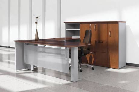 - Les surfaces de travail et les devants de tiroir et d'armoire sont fabriqués à partir de bois de placage véritable tandis que les châssis et les armoires sont finis en mélamine ou en placage de bois.
