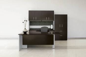 - Les surfaces de travail et les devants de tiroir et d'armoire sont fabriqués à partir de bois de placage véritable tandis que les châssis et les armoires sont finis en mélamine ou en placage de bois.