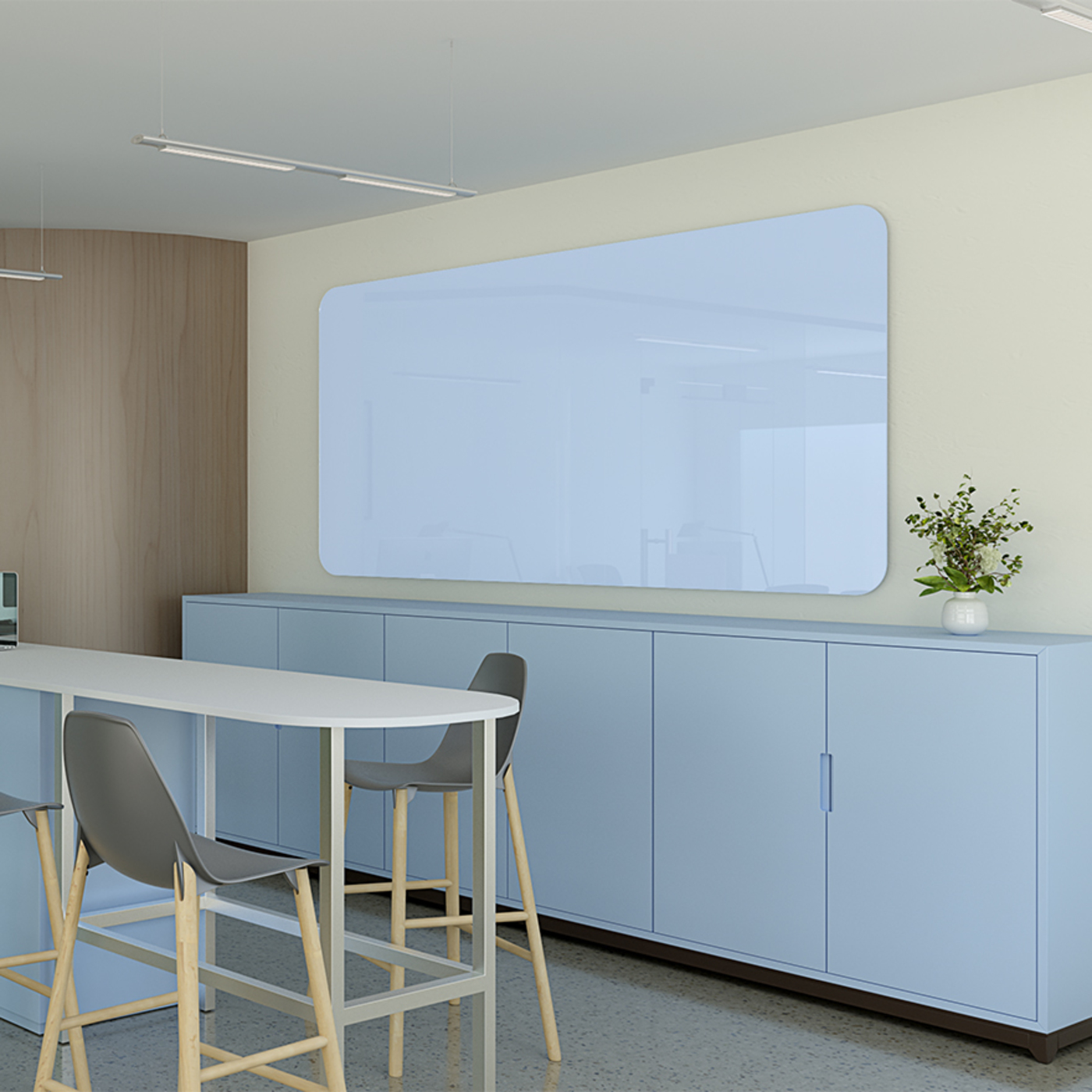 GlassWrite Curve markerboard is defined by its 4” rounded corners for a softer, smoother design. GlassWrite Curved features all the benefits of the GlassWrite design family. Egan GlassWrite is built from a guaranteed-to-clean, crystal clear, low iron tempered safety glass for high clarity of surface and edges. A frameless 1/4” (5 mm) thick glass dry erase board, GlassWrite boards are finished with polished edges and are available in color, as neo-magnet compatible, and with high-resolution printing: EganINK.