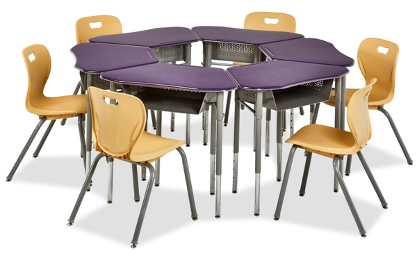 The Alumni Hex Desk was developed as a tool for students and teachers to implement common core learning concepts. It can be arranged in collaborative groups or traditional rows. In it's ideal group configuration of 6, students are able to sit in a circular configuration for group activities and learning. Optional casters make this desk mobile and easy to move into multiple configurations. These desks can then be pulled apart for individual study and testing purposes. Full-frame construction takes the wiggle out of learning.
