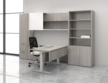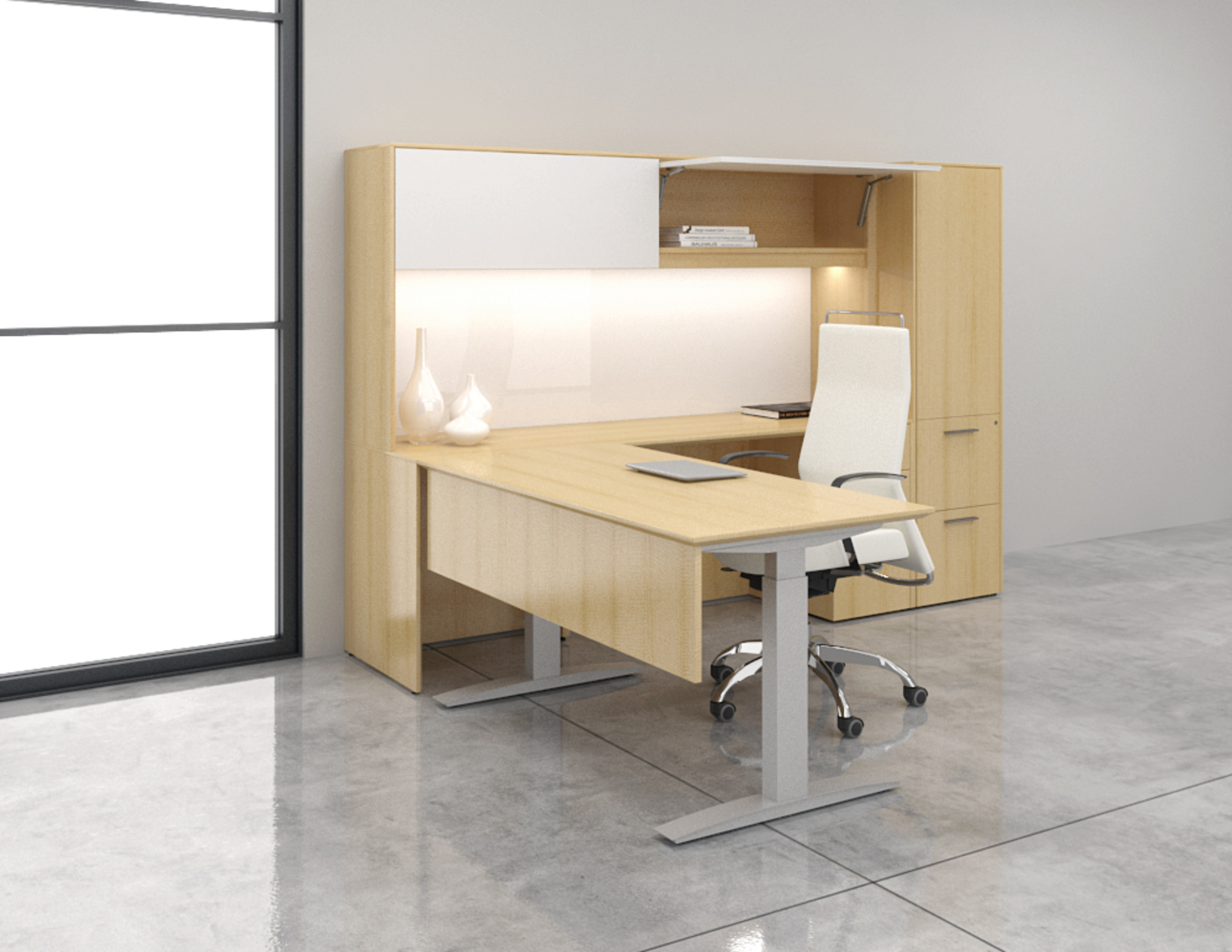 Latitude Work Tables features an elegant design with a thin top profile and integrated wood finger pulls. The wall hung overhead storage cabinets offer a sliding door canopy with a thin profile brushed metal lower shelf for a light weight contemporary aesthetic. Height adjustable surfaces are also part of the product offering.