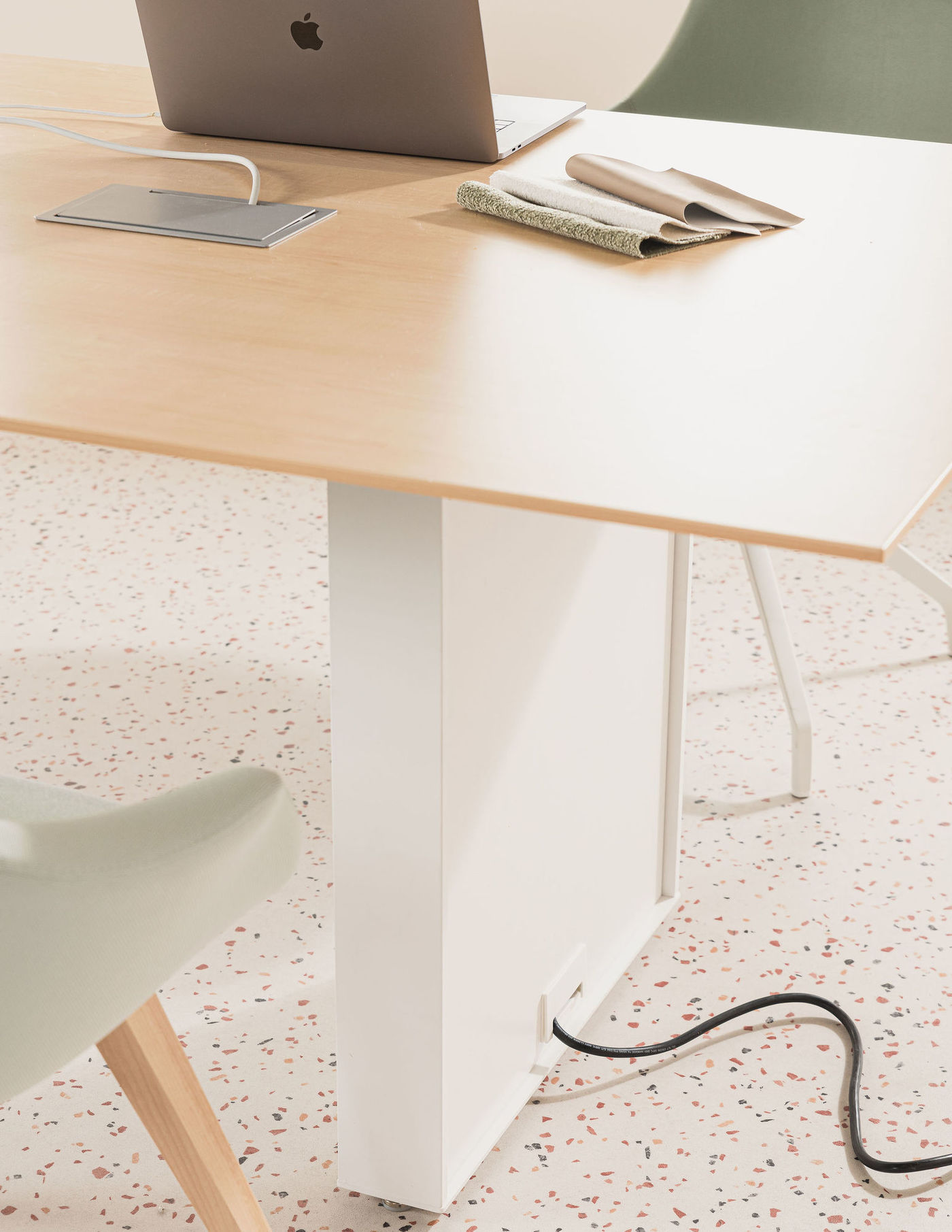Its “O” shaped base allows for easy positioning of chairs around the conference table, creating a comfortable and functional meeting room. The addition of panels inserted into the legs provides efficient management of cabling and equipment connections, resulting in a sleek and uncluttered work environment.