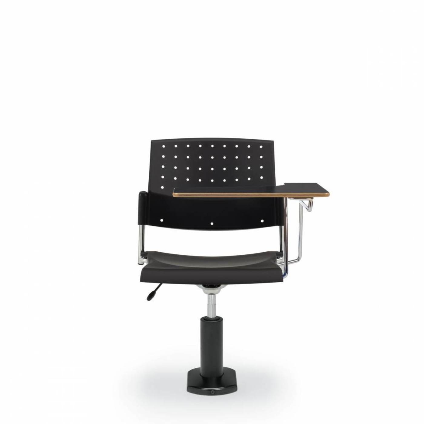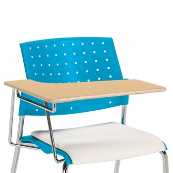 Tablet arm is extremely durable with a solid steel chrome frame and a black polymer surface. The core is hardwood veneer plywood with a clear lacquered edge. Overall tablet size is 18"D x 14.5"W. Can be ordered in a left hand or right hand arm (seated). Not available on stools.
