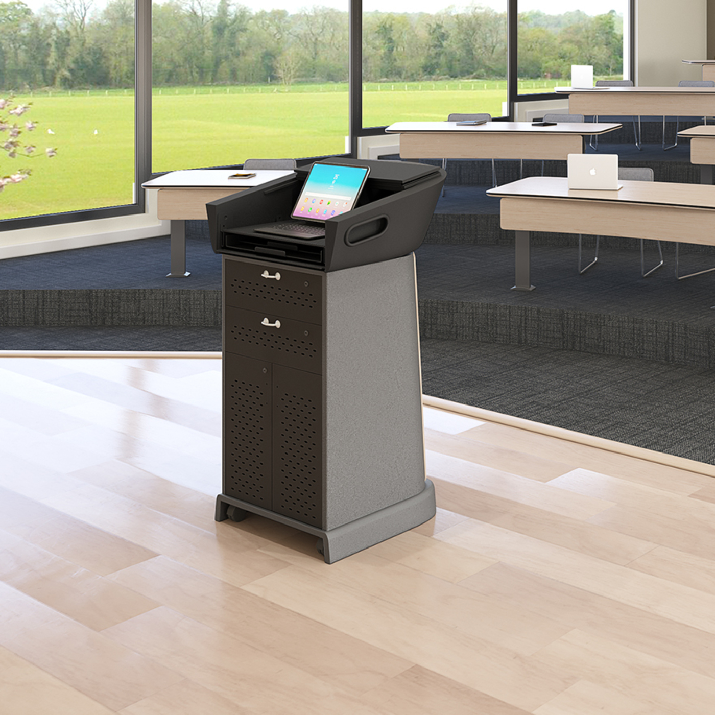 TecTern and TecTern TWO share a common crown design which provides a clean top with a document rail. Opening the bi-fold work surface reveals a laptop tray, or optional finger touch monitor with VGA adapter. Remove the bi-fold work surface to access a spacious cavity for cable management. The front modesty panel offers ventilation and may be removed to access rackmounted components. TecTern TWO features a large chassis with a cable access door, a pull-out drawer and a large rack-mount storage area and shelf. Security locks on all accessible areas are included.