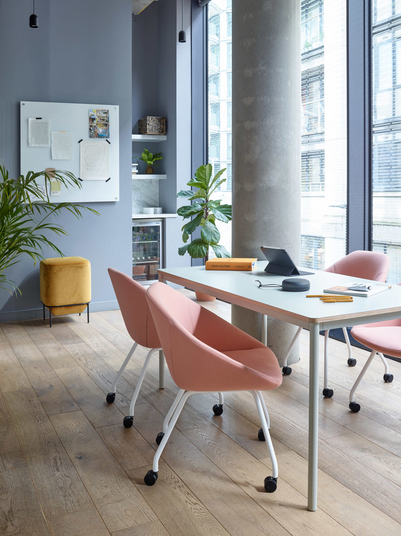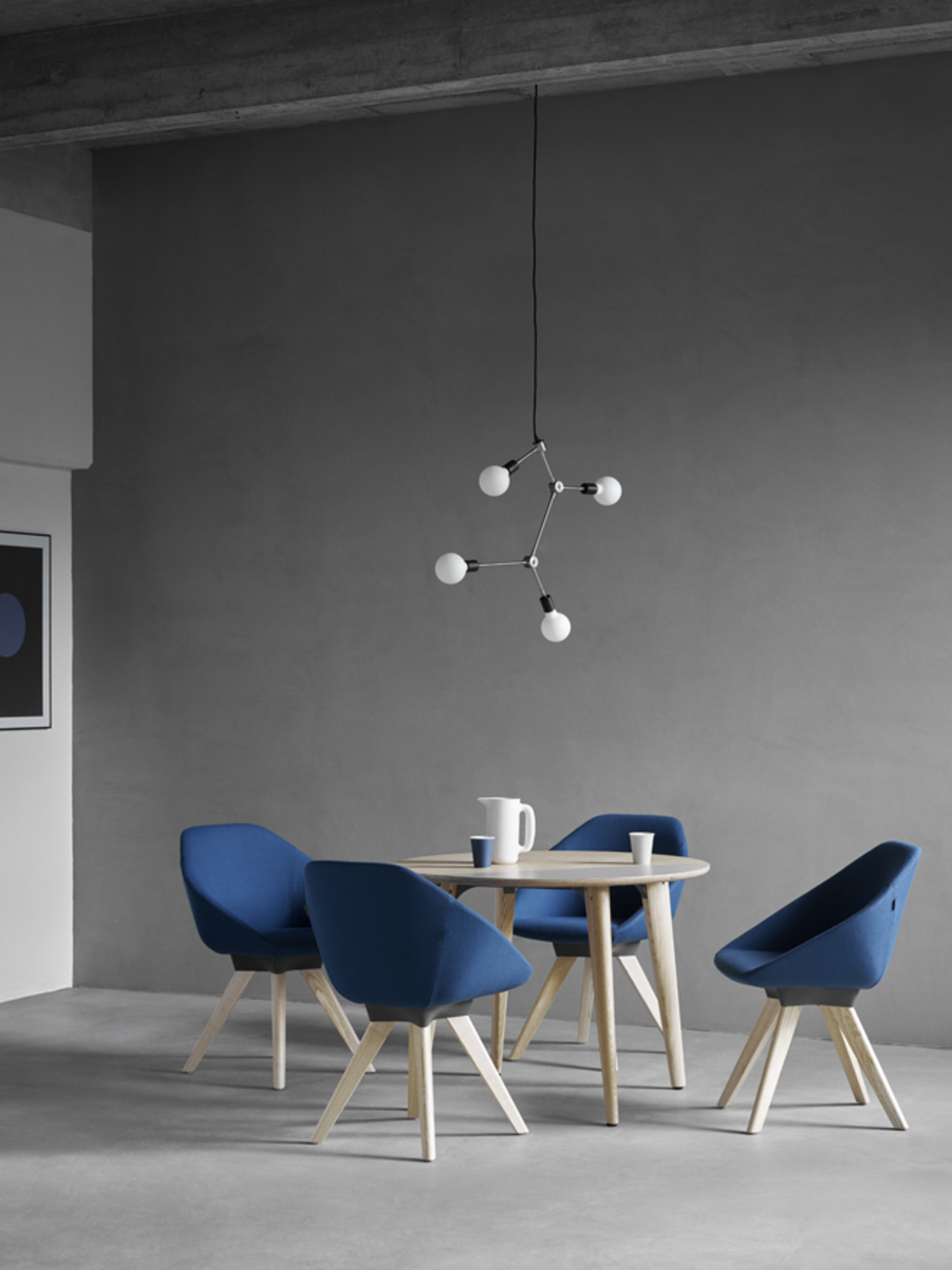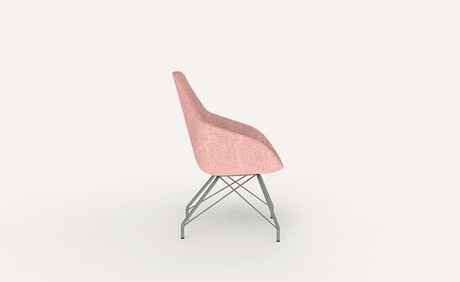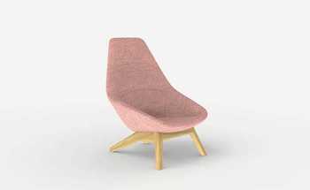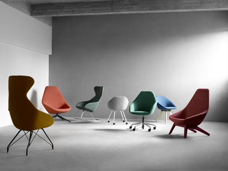La collection Famiglia de Allermuir comprend des chaises et des fauteuils lounge avec dossiers de différentes hauteurs bet un choix de pieds en métal ou en bois et de bases à 5 étoiles.