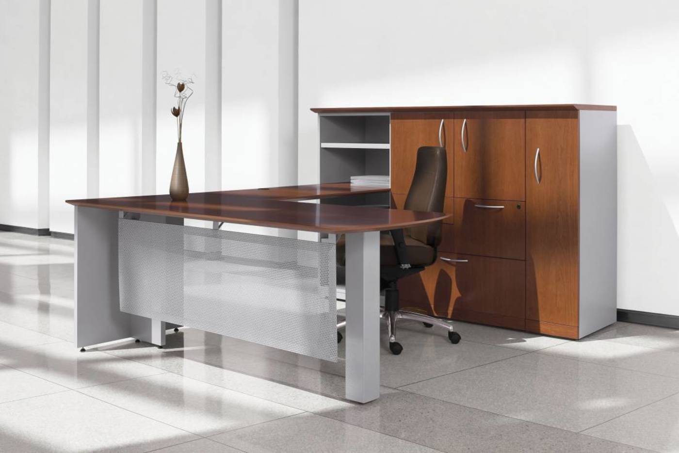 • Les surfaces de travail et les devants de tiroir et d'armoire sont fabriqués à partir de bois de placage véritable tandis que les châssis et les armoires sont finis en mélamine ou en placage de bois.