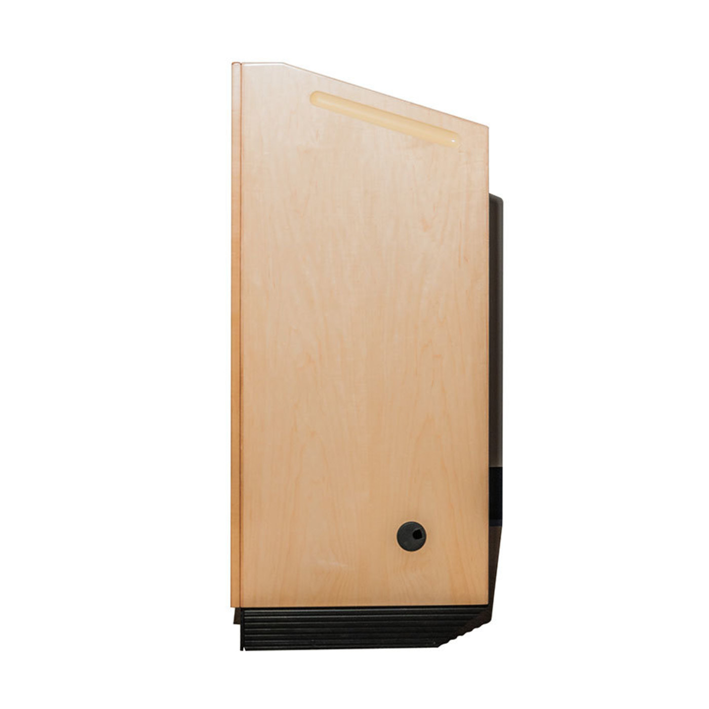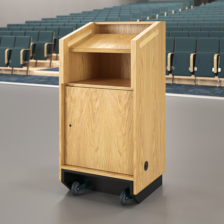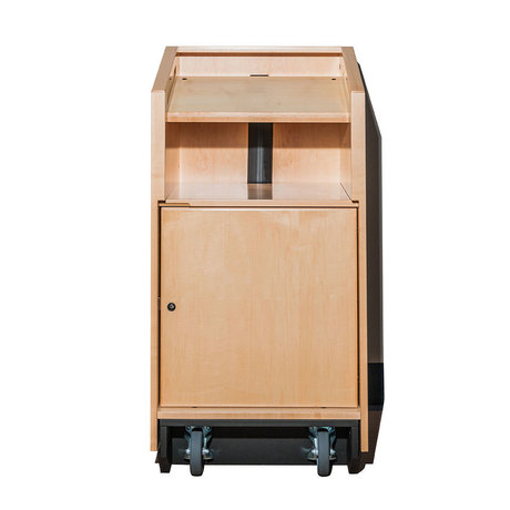 Les deux roulettes du côté du présentateur garantissent que le pupitre ne peut être déplacé qu'en basculant l'unité sur eux (empêche la « fuite » lorsque vous vous appuyez sur le pupitre). Rangement verrouillable et œillets de câblage pour l'installation sur le terrain d'ordinateurs portables, de tablettes et d'un microphone. Une surface inclinée à 17 degrés avec une lèvre en bas convient aux notes de référence.